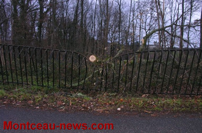 Jeudi dernier, le paysage était magnifiquement givré, malheureusement, le givre qui s’est accumulé sur un arbre en bordure de la route des Thibourins a fait, de par son poids, casser une grosse branche qui est tombée sur la grille du château, près de l’entrée principale de ce dernier.