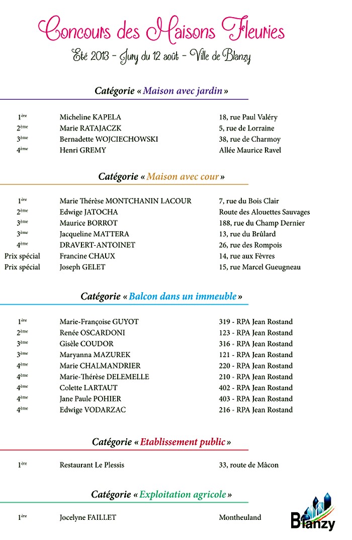 Ce vendredi soir dans la grande salle de l’Espace de Vie et d’Animation de Blanzy avaient lieu la remise des récompenses pour les Blanzynois qui avaient fleuri leur environnement personnel ou professionnel (visite du jury le 12 août 2013) et aussi pour les associations qui avaient participé au dernier nettoyage de printemps du 13 avril 2013.