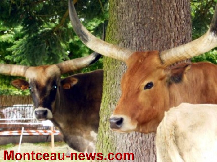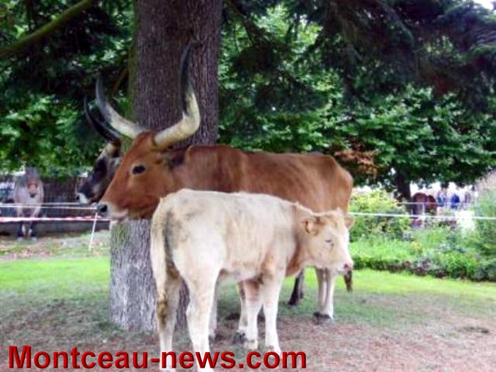 Au fond du parc, un autre enclos pouvait laisser dubitatif : celui des Watussy. Deux splendides femelles de cette race bovine en provenance du Rwanda étaient en effet présentes sous les arbres, avec leurs petits, croisés charolais. L’éleveur d’Ecuisses a racheté ces bêtes en Belgique, dans un parc animalier, avant de les ramener et de les croiser avec la race locale. Il est donc possible de les admirer dans les prairies de l’Etang de la Motte. Quelques aménagements ont cependant été nécessaires, en particulier dans l’étable, compte tenu de la taille des cornes des animaux !