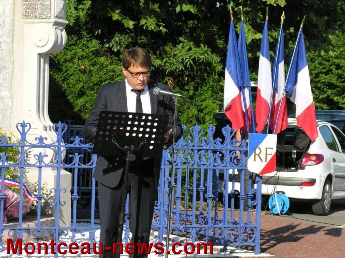 « Nous nous retrouvons pour un rendez vous ô combien important avec l’Histoire, cette Histoire de France écrite jour après jour par les femmes et les hommes de notre pays, bien souvent au péril de leur vie, Histoire de France qui, au-delà des cérémonies du souvenir, ciment de notre République, nous permet de bâtir avec les jeunes générations un futur basé sur les valeurs de la République…..(….)…. Après 4 années de souffrance, de peur, de méfiance, de privation, d’absences de liberté, notre ville retrouvait sa liberté, grâce aussi aux actions des Résistants sur le bassin minier et ses alentours. 70 ans après, pensons à nos glorieux ainés, femmes et hommes de l’ombre, n’écoutant que leur courage, répondant à leurs besoins d’humanité, à leur soif de liberté, pensons à leurs sacrifices qui ont permis que les mots « liberté, égalité fraternité » brillent à nouveau au fronton de nos Mairies…….(…)… Ecoutons aussi la voix de celles et ceux qui ont traversé cette période, entendons leurs témoignages, inspirons nous de leur esprit de sacrifice, de leur courage, de leur solidarité….(…)…. L’avenir se conjugue au présent en s’inspirant du passé…..(…)…. Soyons chacun à notre niveau vigilants, la phrase de Berthold Brecht : « Le ventre est encore fécond d’où a surgi la bête immonde » n’a jamais été aussi vraie, nous tous, Républicains de tous bords, nous devons aller au-delà de nos différences pour préserver l’essentiel mais aussi l’indispensable, c’est-à-dire préparer pour les générations futures un pays où les valeurs de Liberté, d’Egalité et de Fraternité conserveront tout leur sens. N’oublions pas que Ceux qui ne tirent pas les leçons du passé son condamnés à le revivre. »