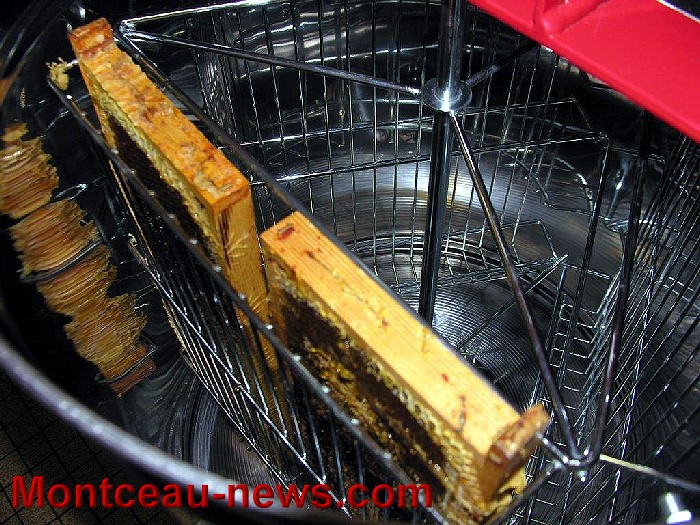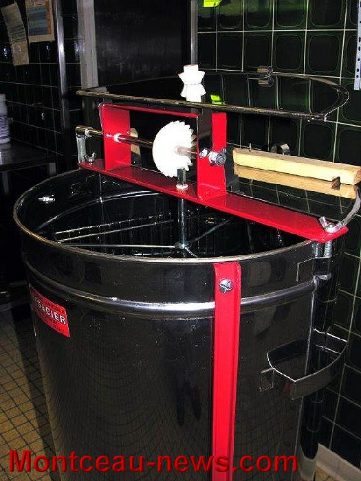 Il a fallu dans un 1er temps, que nos 2 sympathiques élues « raclent » la cire sur les hausses, puis ensuite qu’elles insèrent ces dernières dans l’extracteur (sorte de centrifugeuse) pour en extraire le miel et enfin qu’elles mettent ce dernier dans un appareil à maturation où il reposera 15 jours.