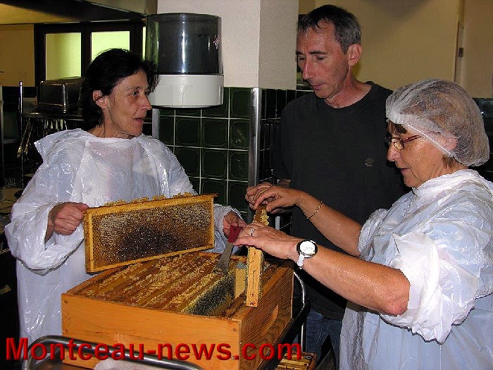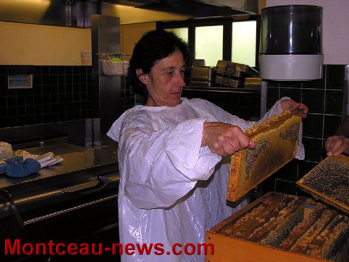 Ce vendredi après midi, en présence de la directrice Brigitte Yvoz et des 2 élues blanzynoises : Floriana Bouillot et Christiane Charrier, Pascal Uliczny, le référent apiculteur de Blanzy, muni de son matériel approprié a déposé aux cuisines de la Résidence Jean Rostand les 4 hausses des 3 ruches situées près de l’étang des Mirauds.