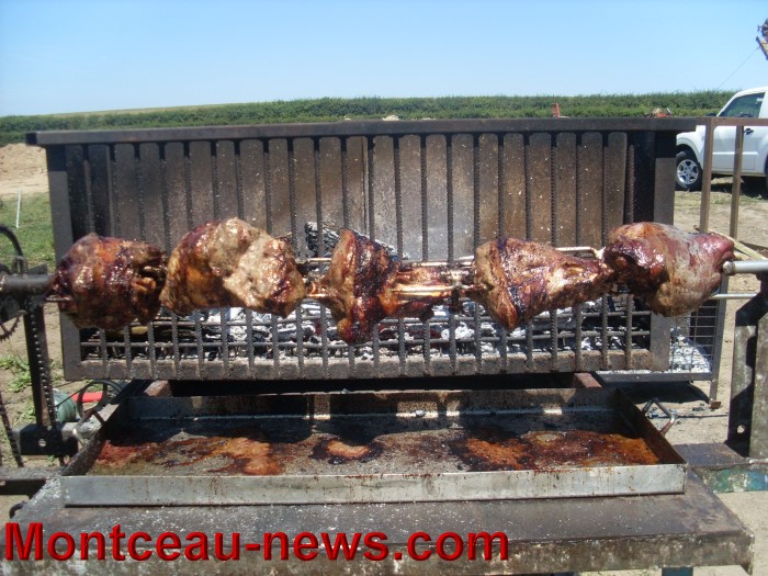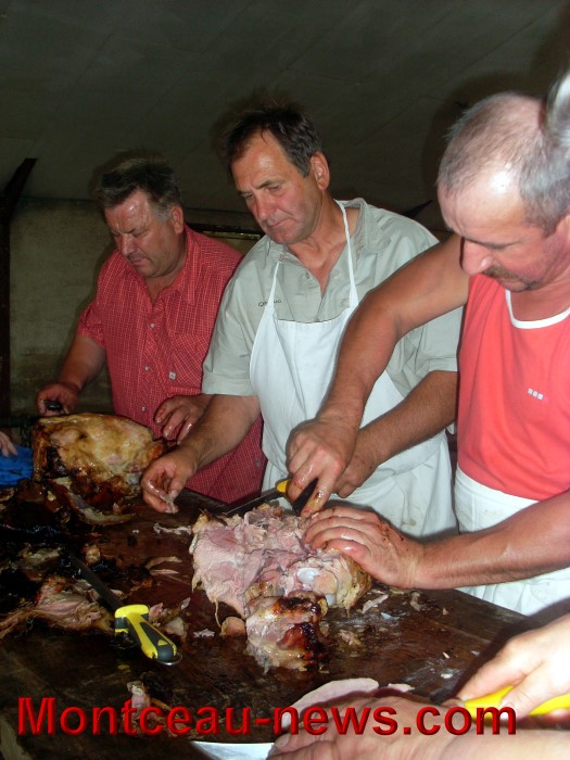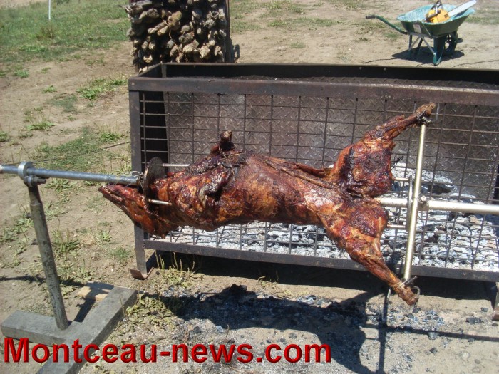 Alors bien sûr , c’est du boulot quand il faut tout préparer … les salades , les tourne-broches , les p’tites choses qui font les grandes réalisations , mais tou(te)s ont l’habitude , chacun est dans son rôle , c’est en effet une « réunion » qui dure depuis au moins 10 ans . La cuisson des jambons , du sanglier , du chevreuil est une affaire d’experts et ce sont des experts … même dans la fabrication des tourne-broches. Et puis en cette période de grande sécheresse , tout est prévu au cas où….