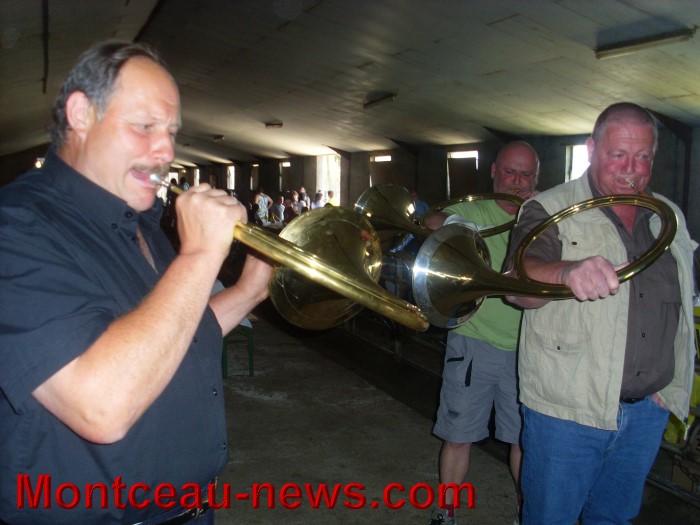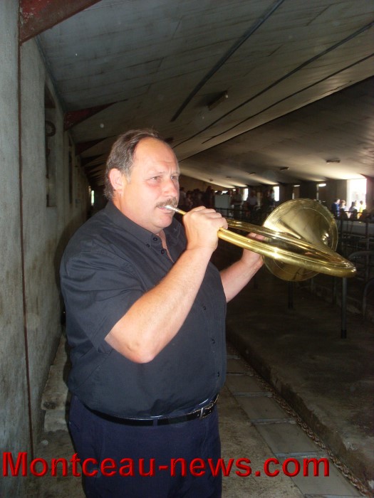 De temps à autre , on pouvait entendre 3 sonneurs de cor de chasse faire vibrer les tympans de l’assistance . Ca sonnait fort dans la stabul , surtout lorsqu’ils se faisaient écho. Les 3 membres des « échos de Gaffrant » , école de trompe de Perrecy-les-Forges , fondée en 2006 et qui étaient dans les lieux ont donné du souffle et des décibels musicaux à la fête.