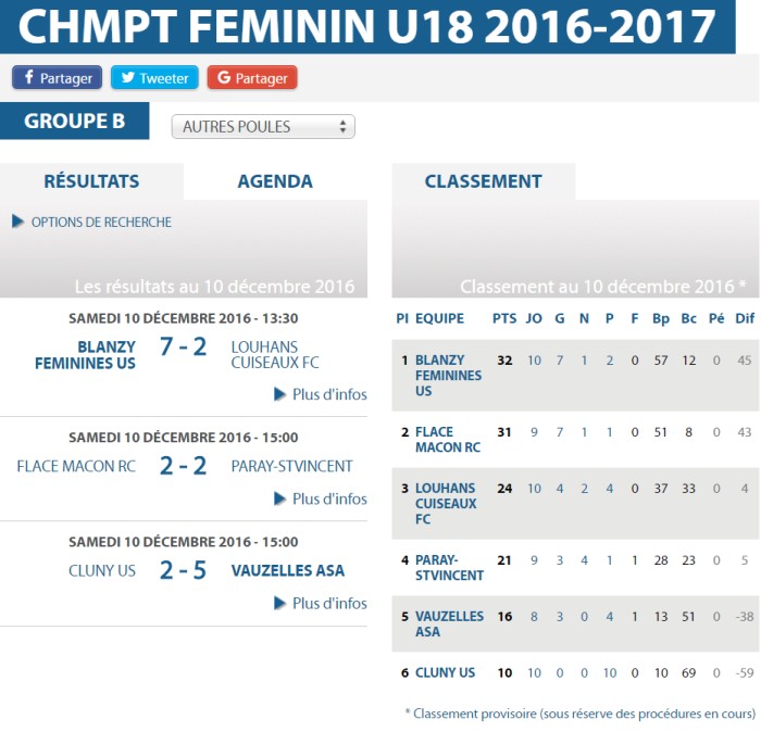 Pour finir, un mot sur les U18 de Stéphane Da Silva. Une nette victoire ce samedi à domicile (7-2) contre Louhans/Cuiseaux, qui permet aux filles de prendre la tête de la Poule B du championnat Honneur Régional Féminin U18 devant Flacé/Mâcon (tenu en échec par Paray). Une belle performance qu’il convient de saluer. Le club travaille dans l’ombre sur la formation et cela se remarque aisément à la vue des résultats cette saison. On associe les U15 et les plus jeunes à cette réussite. Blanzy Féminin a de l’avenir, qu’on se le dise.