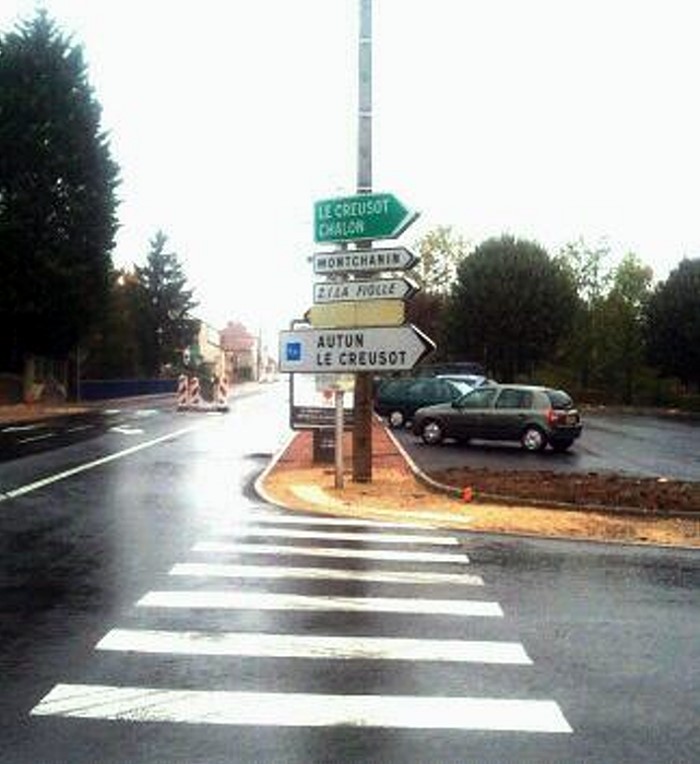 « Je suis venu voir ma mère qui habite Blanzy et qui me parlait des trottoirs en réfection, et dont la fin des travaux me parait lointaine, aux risques de chutes. Mais j’ai trouvé encore beaucoup mieux….! Vous trouverez la photo en pièce jointe d’un futur passage piétons qui ne manque pas d’humour… En fait les piétons butent sur une forêt de panneaux, publicitaires, indicateurs et autre réverbère, vous me direz qu’il faut attendre que cela soit fini… peut être mais au prix d’autres travaux encore des travaux qui sont payés par qui ? Pour l’instant, il faut descendre sur la route pour passer de l’autre coté, ce qui est pour le moins paradoxal pour un trottoir. Enfin c’est le lot des piétons, bien sûr, au profit des voitures et surtout de la progression inquiétante de la bêtise« .