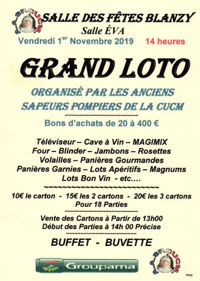 Association des Anciens Sapeurs Pompiers de la CUCM, organise un LOTO le VENDREDI 1er NOVEMBRE 2019 Salle des Fêtes de BLANZY