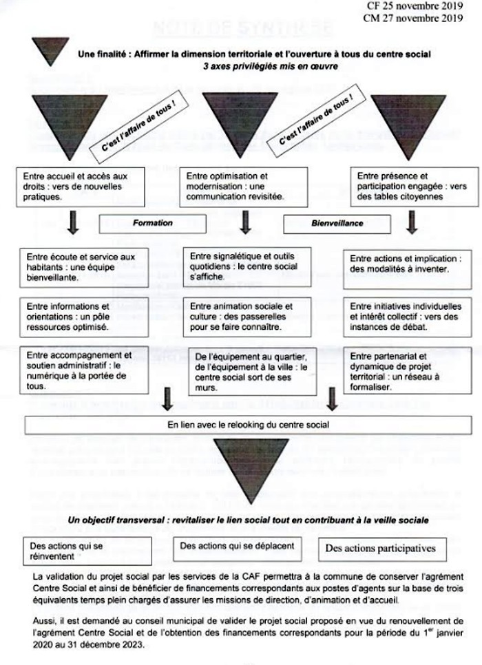 Aussi, il est demandé au conseil municipal de valider le projet social proposé en vue du renouvellement de l’agrément Centre social et de l’obtention des financements correspondants pour la période du 1er janvier 2020 au 31 décembre 2023.