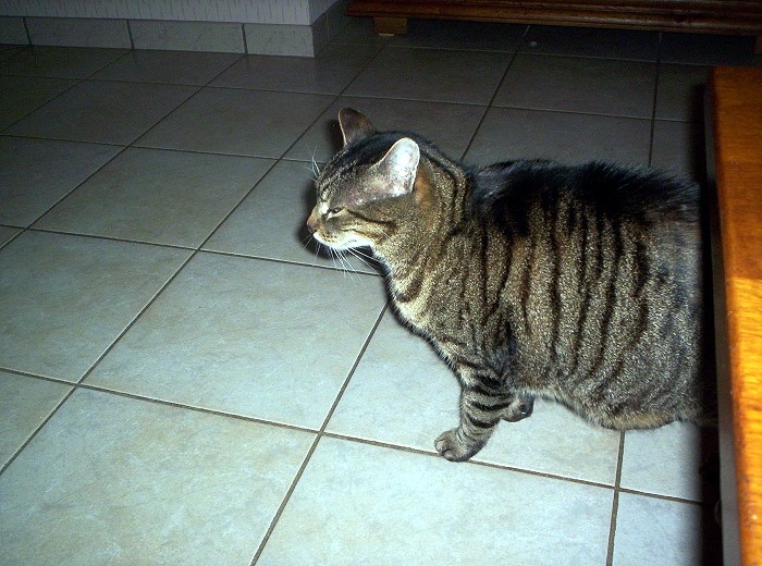 C’est un chat de 8 ans stérilisé assez haut sur patte et corpulent au niveau de l’arrière train, il est possible qu’il lui manque du poil sur le dos (il a tendance à les arracher quand il est stressé).