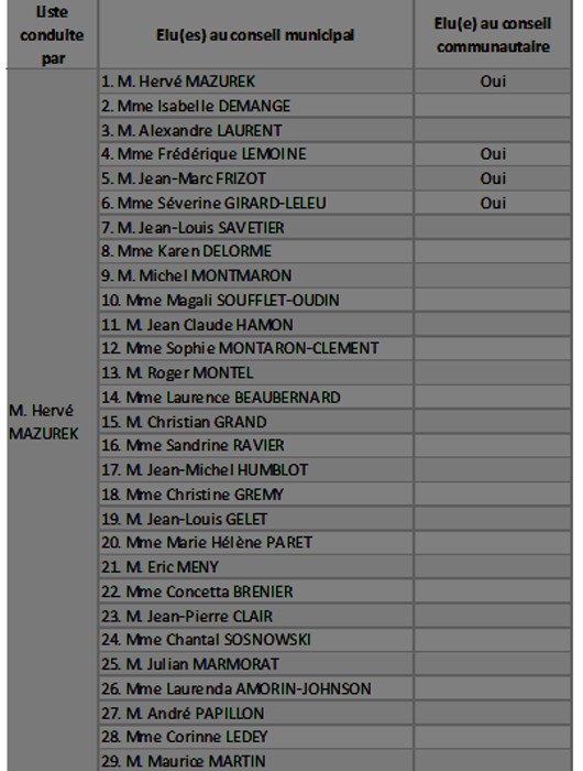 La Liste conduite par Hervé Mazurek a obtenu 1284 voix, ce qui représente 26.62 % des inscrits et 100 % des suffrages exprimés. Elle bénéficie ainsi de 29 sièges au conseil municipal et de 4 sièges au conseil communautaire