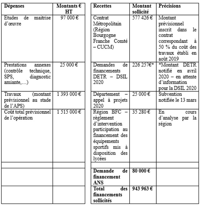 - la Région Bourgogne Franche Comté au titre du règlement d’intervention spécifique relatif à la participation de la Région aux financements des équipements sportifs mis à disposition des lycées,