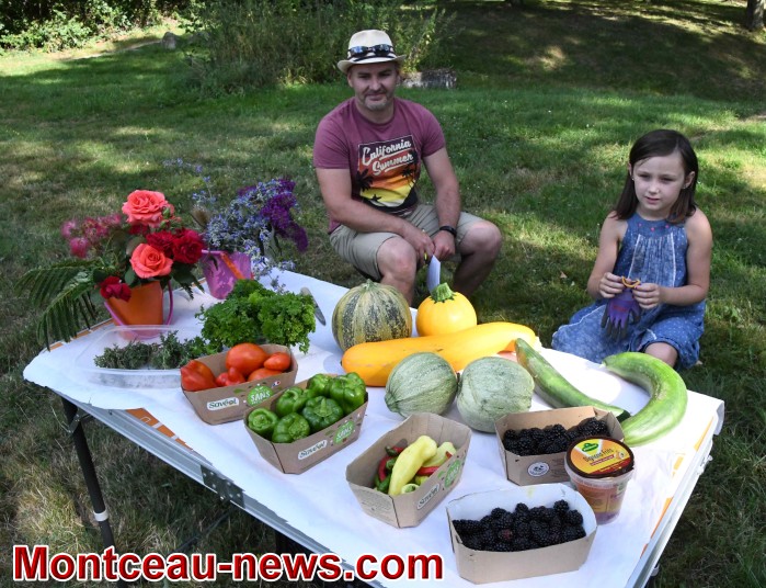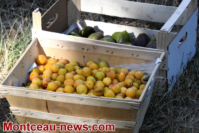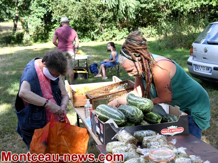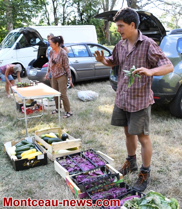 Les vendeurs s’acquittent d’un droit de place de 3€ et installent leur étal qu’ils garnissent de leur production ou cueillette : courgettes, salades, poivrons, piments, haricots, mûres, figues, prunes,…