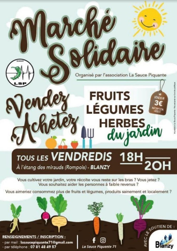 L’association blanzynoise « La Sauce Piquante 71 » organise un marché solidaire tous les vendredis de 18h 00 à 20h 00 à l’étang des Mirauds (Rompois)