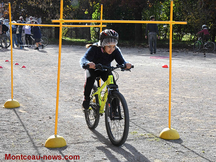 Puis, à l’extérieur, parcours de maniabilité : passer sous un obstacle, tourner, slalomer entre des plots, freinage, ramasser un objet en roulant, …
