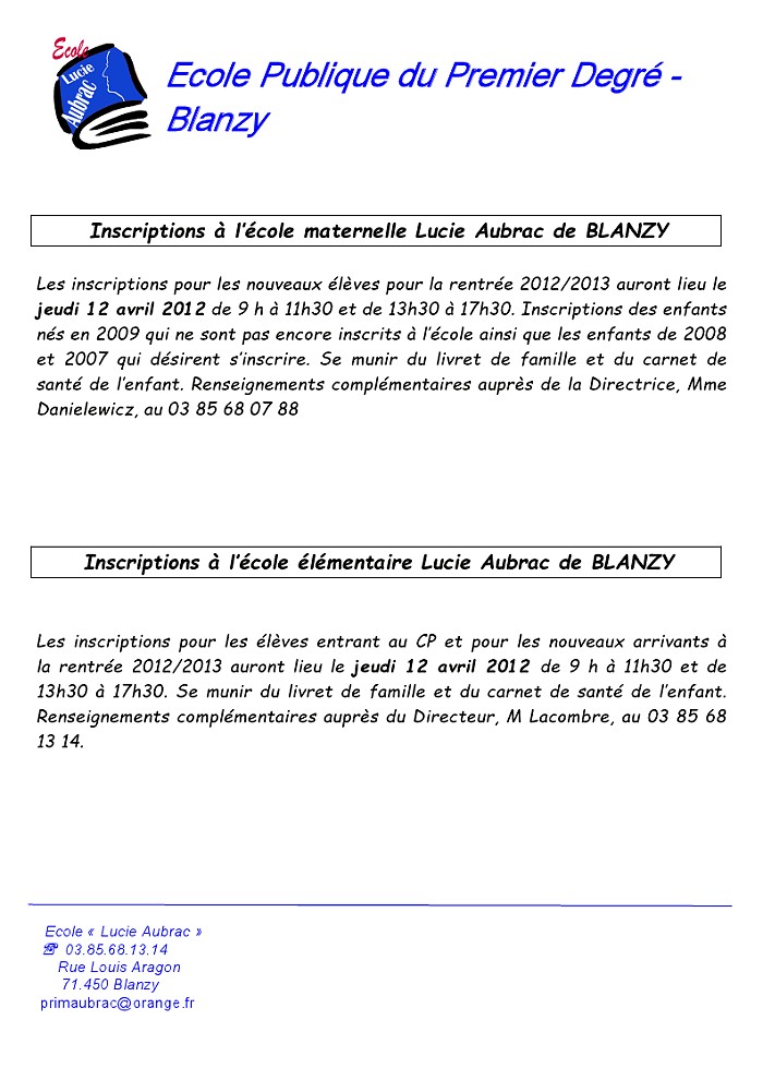 Les rendez vous pour inscrire vos enfants pour la rentrée 2012/2013