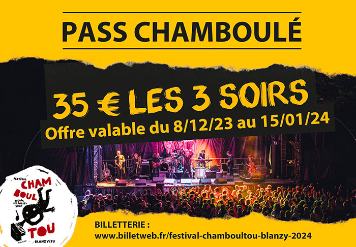 Ce pass vous donne accès aux 3 soirs du Festival Chamboultou les 28, 29 et 30 juin 2024.