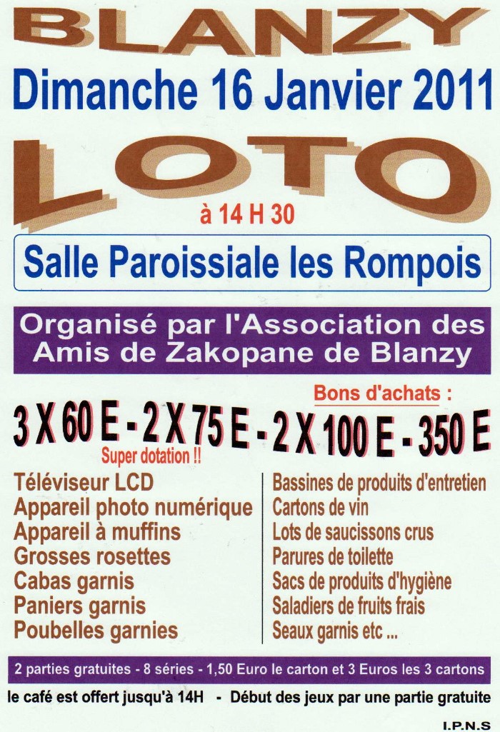 Loto ce dimanche 16 janvier 2011 à la salle paroissiale Les Rompois
