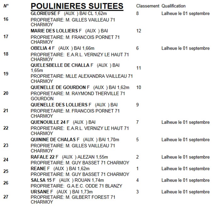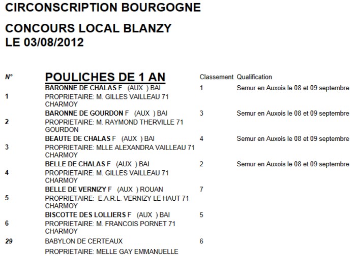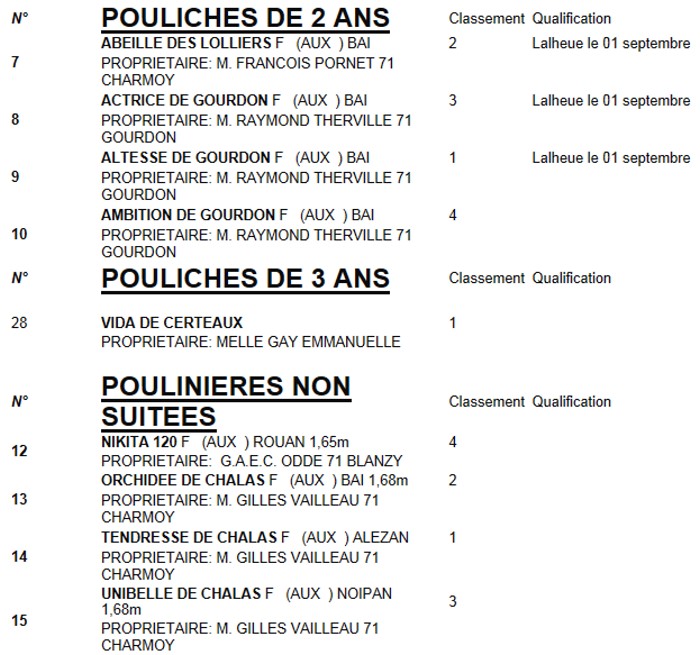 – Et selon un barème très défini, les résultats furent proclamés comme suit, avec en plus pour certains une qualification à la finale départementale de Lalheue le 1er septembre et de Semur en Auxois le 9 septembre.
