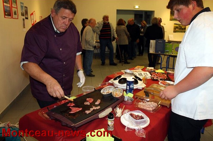 Le boucher Blanzynois, M. Buchaudon et son apprenti étaient sur place et, profitant de la semaine du goût ont offert une succulente dégustation de viande. Cela a très bien accompagné le verre de l’amitié.