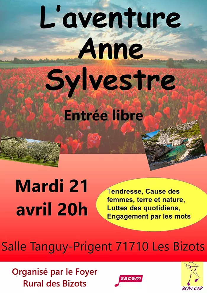 Dans le cadre de ses Mardis d’animation, le Foyer Rural des Bizots accueille l’Association Bon Cap pour un récital d’Anne Sylvestre emprunt de liberté, d’humour, de poésie, de « légèreté », de tolérance, mais aussi la mise en évidence de la condition féminine, du couple, de l’âge…de la vie tout simplement !