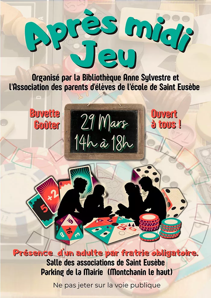 La Bibliothèque Anne Sylvestre et l’Association des Parents d’élèves de l’école de Saint-Eusèbe (APESE) proposent un après-midi convivial de jeux de société, pour tous les âges :