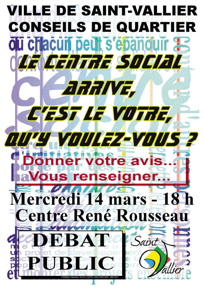 Une démarche participative a été engagée : premières rencontres avec la population par l’intermédiaire des conseils de quartier, enquête auprès des jeunes en collaboration avec le collège, contacts avec les associations. Venez partager vos idées sur le centre social lors d’un débat public le mardi 14 mars à 18 h au centre René Rousseau.