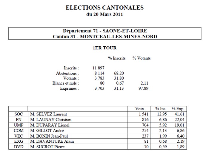 Cantonales 2011 : résultats canton Montceau Nord (1er tour)