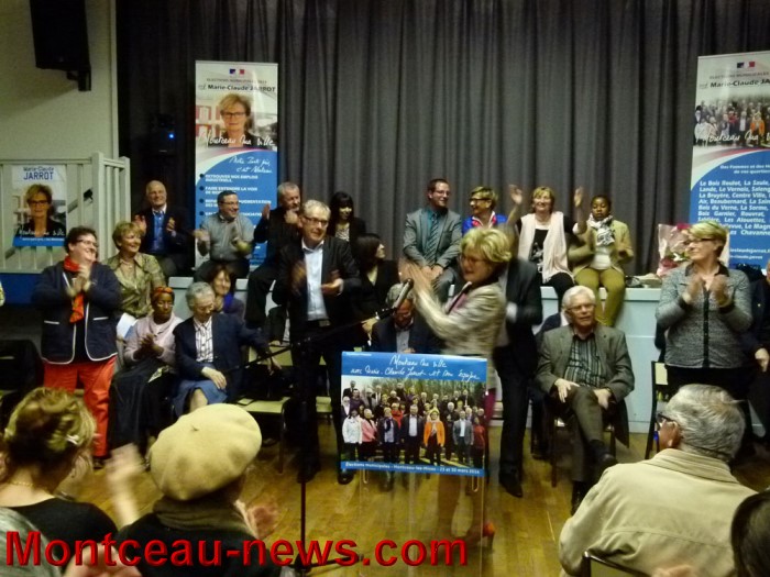 250 personnes étaient venues soutenir la candidate ce 19 mars à la salle des fêtes du Bois du Verne, et certains piaffaient dans le hall, faute de place dans la salle. Une soirée politique fort bien orchestrée, avec pour commencer quelques interviews rapides de militants dans la salle puis entrée triomphale de Marie-Claude Jarrot et de ses colistiers.