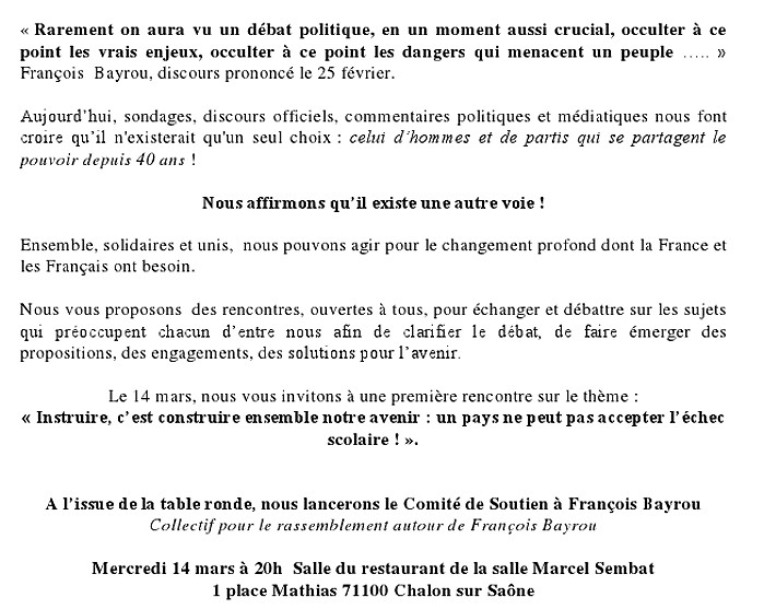 Première rencontre publique du comité de coordination autour de la candidature de François Bayrou, le mercredi 14 mars, à Chalon-sur-Saône