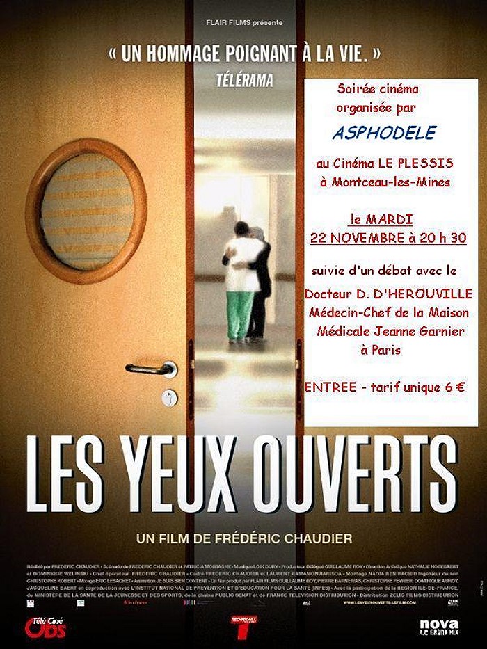 Au programme : la projection du film « Les Yeux ouverts », d’une grande humanité, un film témoignage sur la fin de vie du père du réalisateur Frdéric Chaudier. Il a été tourné à la Maison Médicale Jeanne Garnier à Paris qui est un service de soins palliatifs.