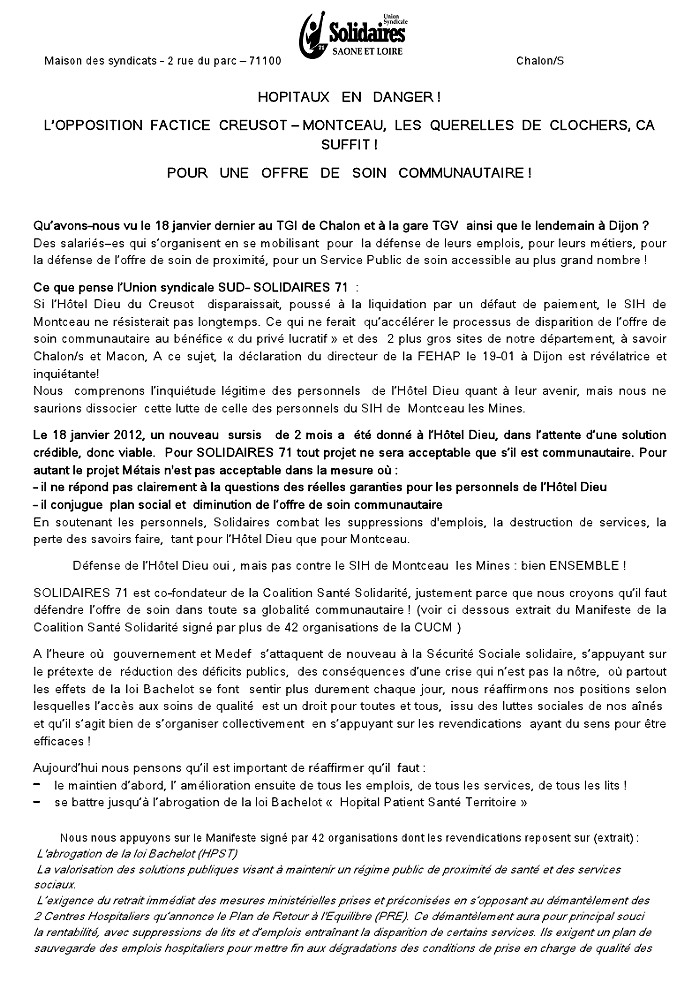 "Hôpitaux en danger", écrit l'Union Syndical Sud Solidaires 71