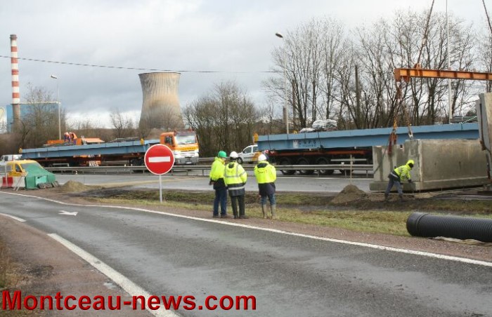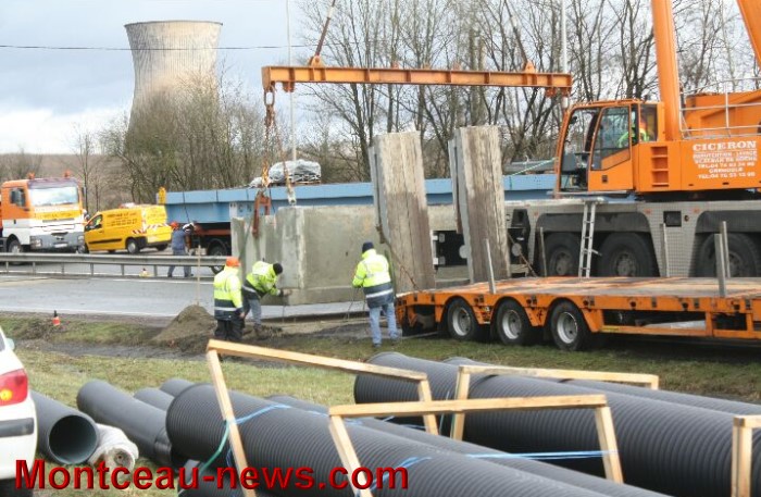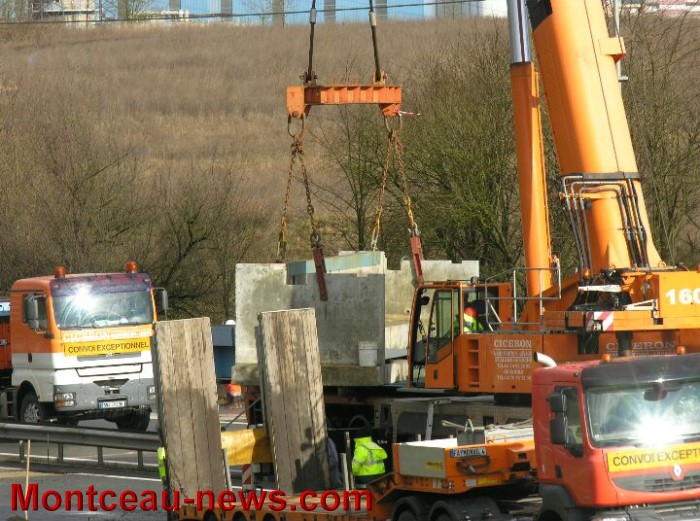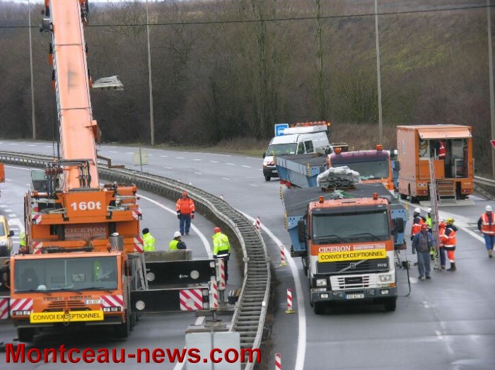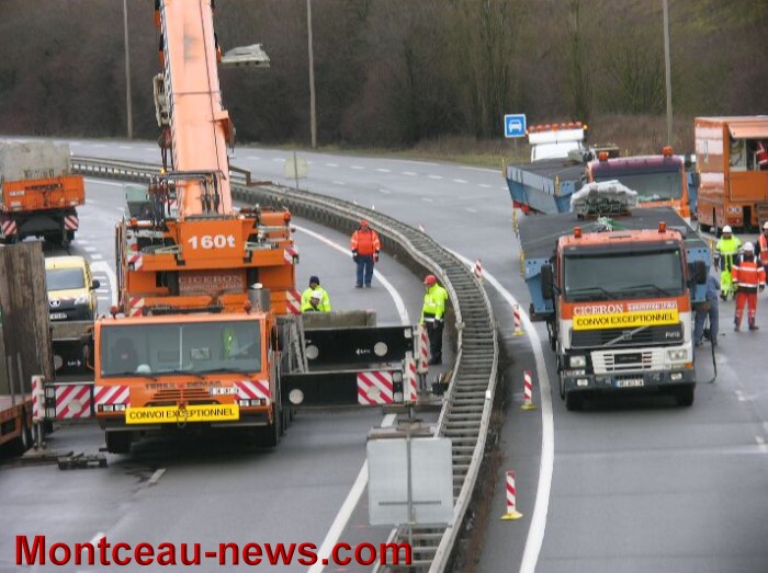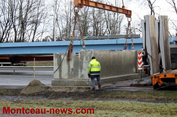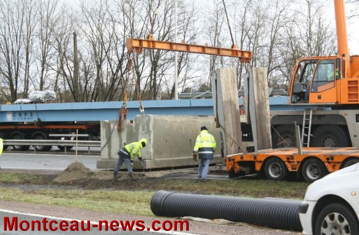 Vers 15h sont arrivés les 2 convois transportant les 2 éléments du pont qui seront installés et l’on est en train de poser les supports en béton de ce pont mobile