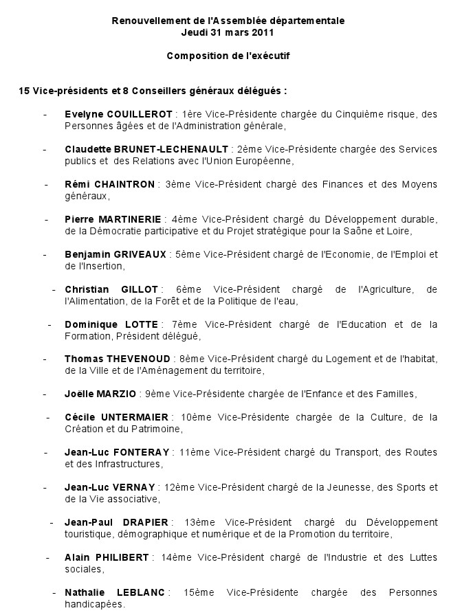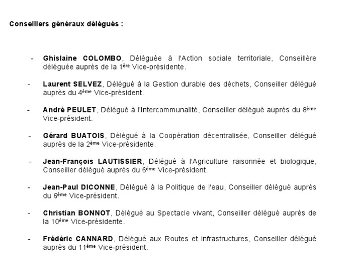 Mais également la composition du nouvel exécutif départemental .qui compte 15 vice-présidents et 8 conseillers généraux délégués.