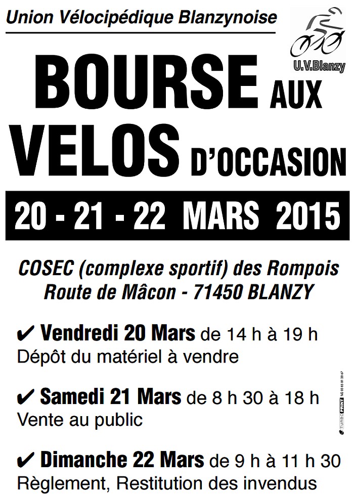 C’est pour cela, que l’U.V.blanzynoise organise une bourse aux vélos d’occasion qui permettra à chacun d’acquérir à moindre coût un vélo à sa convenance, (enfant, homme, femme) : pour tout type de terrains et d’activités. Il sera aussi présenté différents accessoires (excepté des vêtements).