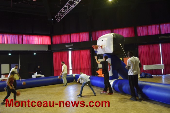 Basket, sur un parquet de la salle Bourdelle délimité par une structure gonflable Sport alimentation : animé par Lab71 Equilibre alimentaire dans la pratique d’un sport avec animations interactives.