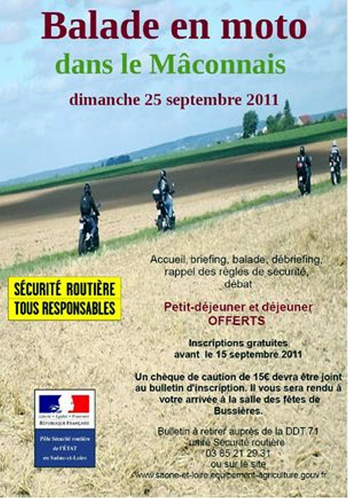 Au vu du succès rencontré lors de nos deux précédentes balades en moto (septembre 2010 et mai 2011) l’Unité Sécurité Routière et le groupe deux roues motorisés vous invitent à les rejoindre, le 25 septembre 2011 à la salle de fêtes de Bussières, pour une balade en moto sous le signe de la sécurité routière.