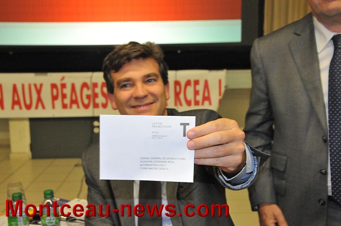 « J’aurais préféré un référendum, qui se serait déroulé dans les mairies,mais le préfet de Saône-et-Loire a saisi le tribunal administratif de Dijon qui a suspendu ce référendum, cependant le Conseil a souhaité maintenir cette consultation de la population afin de montrer son opposition aux péages et défendre l’alternative gratuite » a exposé, en substance, M. Montebourg avant d’expliquer que cette écotaxe, payée par les poids lourds de plus de 3,5 tonnes empruntant cet axe, assurerait un financement 100% public des travaux de mise à 2X2 voies. Sans trop entrer dans le détail, signalons tout de même que le Conseil général demande 1% de l’écotaxe nationale auquel s’ajouterait l’écotaxe départementale estimée à 2 millions d’euros par an. Cela pour le financement des travaux et, pour ce qui est de la suite, c’est à dire l’exploitation : le versement par l’Etat de la subvention d’équilibre envisagée dans le cas d’une mise en concession et l’octroi des moyens actuellement consacrés par l’Etat pour le fonctionnement de cet axe en tenant compte que ceux-ci ont diminué dans la perspective de la mise en concession.