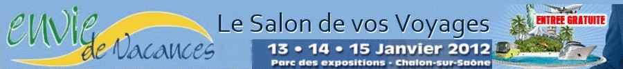 Envie de vacances, de prendre le large, de trouver les Bons Plans pour vos prochaines vacances : un seul rendez vous le SALON de VOS VOYAGES – 13 au 15 janvier 2012 – Parc des Expositions – Chalon Sur Saône. Entrée Gratuite.