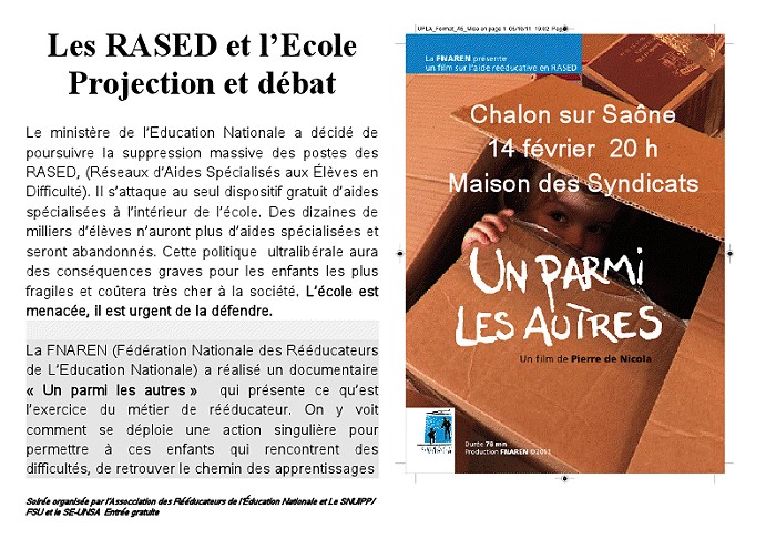 Projection et soirée débat sur les RASED, ce mardi 14 février 2012, à Chalon-sur-Saône