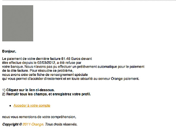 Je sais que chez orange quand vous oublier de payer ,orange vous envoi un SMS vous disant de penser à régler votre facture hors ce mail ne l’ayant pas reçu;j’ai tout de suite penser à une arnaque