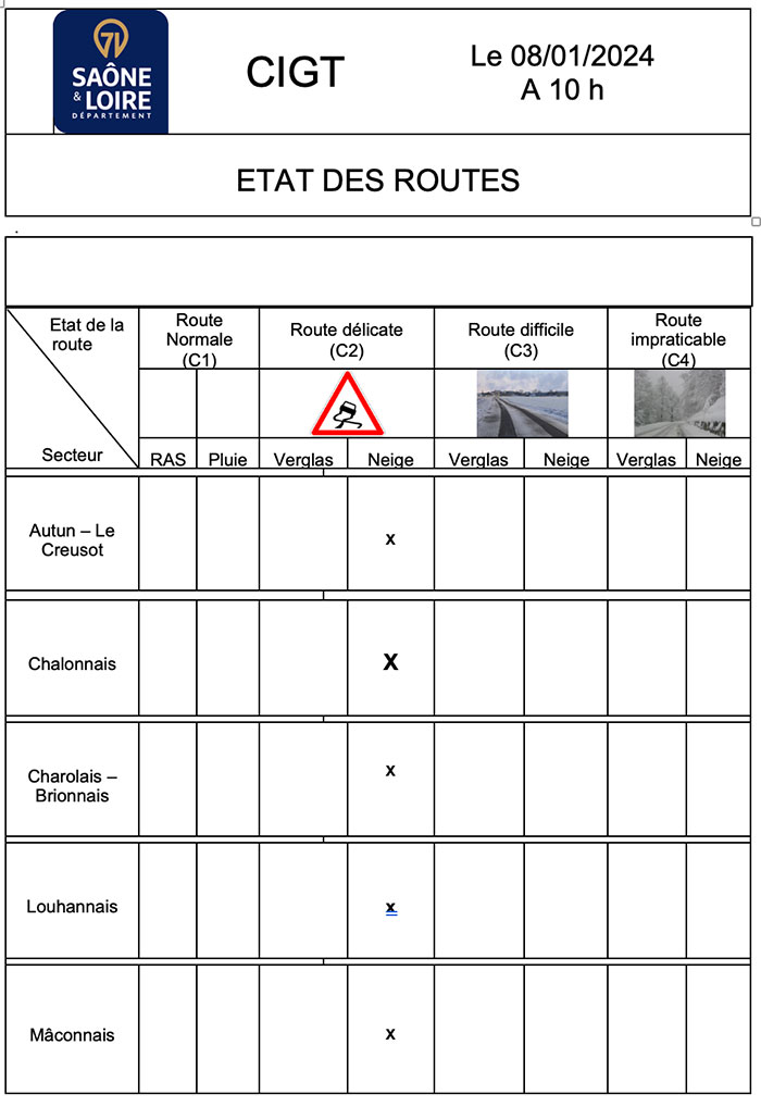 Etat des routes en Saône et Loire de ce lundi 8 janvier 2024 à 10 h 00