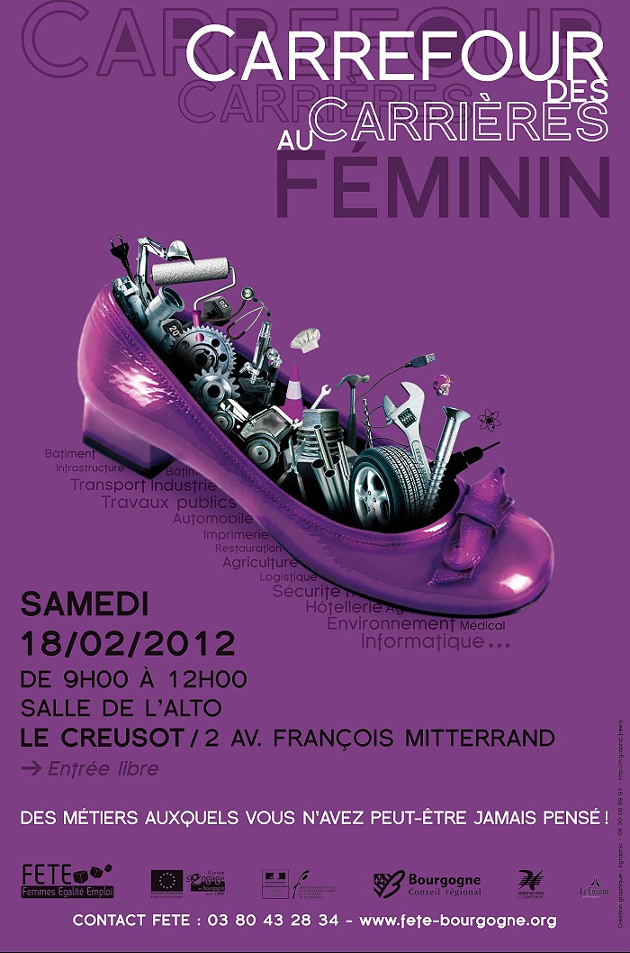 Cette année, le carrefour des carrières au féminin aura lieu au Creusot le samedi 18 février 2012 de 9h à 12h. Cette manifestation consiste à présenter des métiers à des jeunes filles en cours d’orientation et à des femmes en projet de reconversion. Une cinquantaine de femmes exerçant des métiers, encore peu féminisés (ingénieures, officiers de gendarmerie, journaliste, agricultrices, œnologues, etc) participent au carrefour. Par un témoignage direct, par un échange libre, celles-ci présenteront concrètement leur métier, leur expérience et répondront aux questions des visiteuses.
