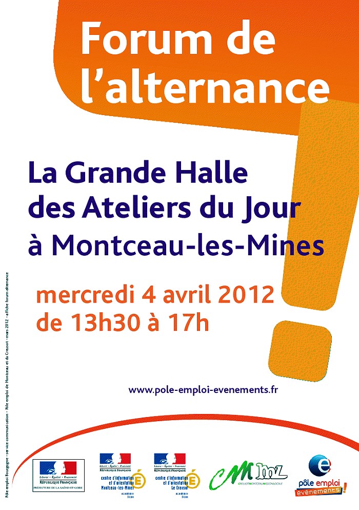 Un forum de l’alternance se déroulera ce mercredi 4 avril 2012 de 13h30 à 17h à la Grande Halle des Ateliers du Jour à Montceau-les-Mines.