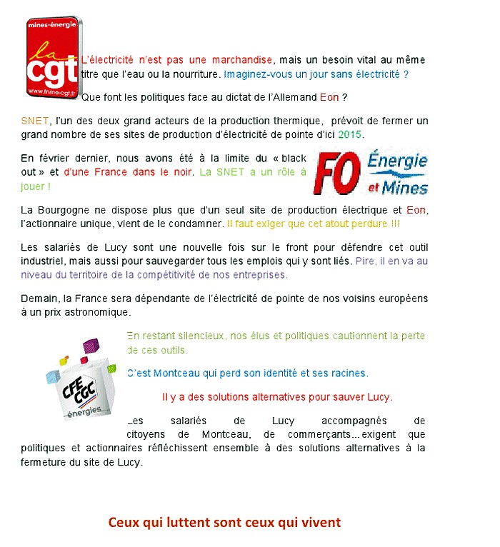 Les salariés de la centrale Lucy ont diffusé ce tract :