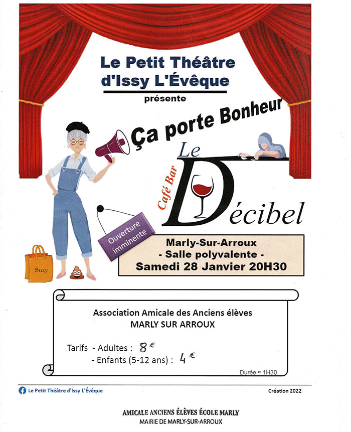 L’amicale des anciens élèves de l’école de Marly sur Arroux organise une soirée théâtrale le samedi 28 janvier 2023 à 20h30 à la salle polyvalente.