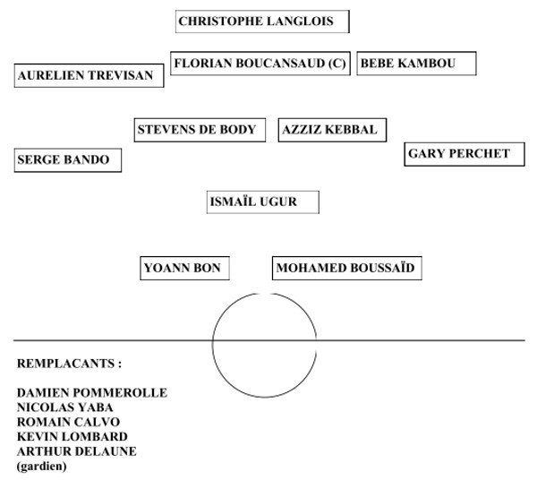 L’équipe alignée d’entrée, ce soir sera donc totalement modifiée, avec un 3-5-2, c’est-à-dire 3 défenseurs plus 2 ailiers chargés de défendre et de venir chercher loin le ballon, 5 milieux montant et descendant et 2 attaquants de pointe. Voila le schéma :