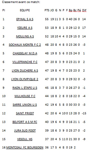 Oui ce soir à 18h le FCMB Montceau joue son match de retard contre Sarre-Union, la victoire est capitale pour le maintien et pour la suite du championnat ! Ce soir il faudra tout donné sur cette rencontre et avoir aucun regret, l’équipe en est capable mais pour cela il faudra jouer collectivement aussi bien derrière que devant et surtout rester vigilant jusqu’au sifflet final . Maintenant à vous de démontrer que vous mériter de rester en CFA, moi pour ma part j’y crois . Allez les rouges et blanc …..