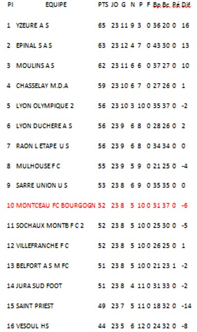 C’est dommage, puisqu’au lieu de laisser Jura Sud à 8 points, ces derniers reviennent à 1 point et les rouges et blancs restent sous la menace de leurs poursuivants. Il faut espérer qu’il ne s’agit là que d’un accident de parcours et que les Montcelliens vont se reprendre dès samedi prochain, aux Alouettes, devant Saint Priest, un autre mal classé !