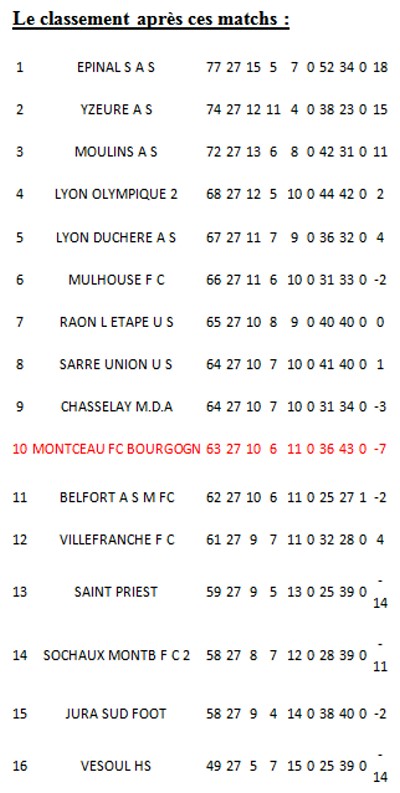 Montceau avait même le 3 à 2 à sa portée mais, hélas, Mulhouse allait par la suite marquer par 3 fois aux 59, 68 et 71ème minutes pour remporter ce match et laisser les rouges et blancs à 3 points derrière au classement. Tout reste donc à faire dans les 3 dernières rencontres et en particulier la semaine prochaine, samedi, à 18h, au stade des Alouettes contre Vesoul.