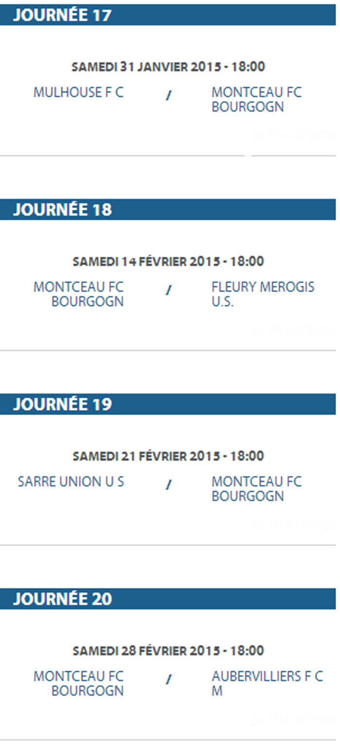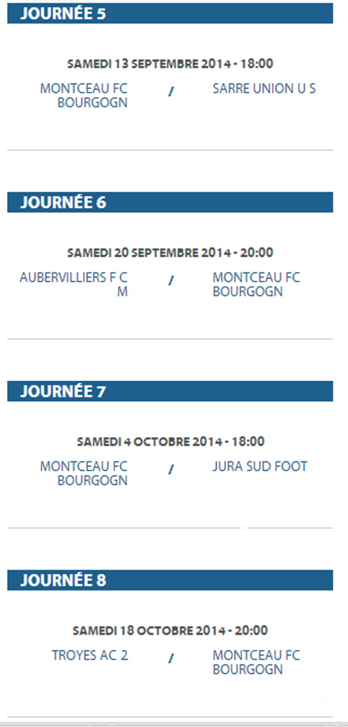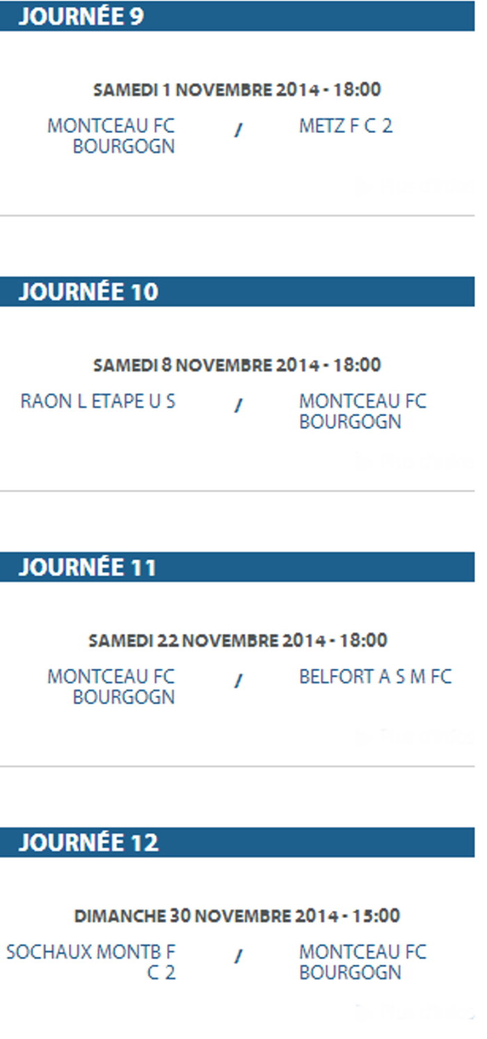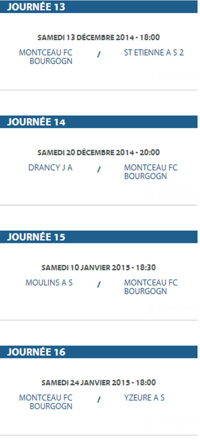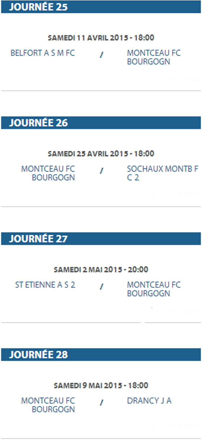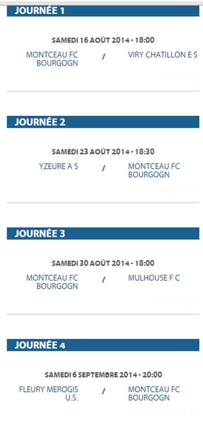 Voici la liste des rencontres de la saison 2014/2015 du F.C. Montceau-Bourgogne. Une saison qui va s’ouvrir le 16 août par une rencontre, au stade des Alouettes à Montceau.